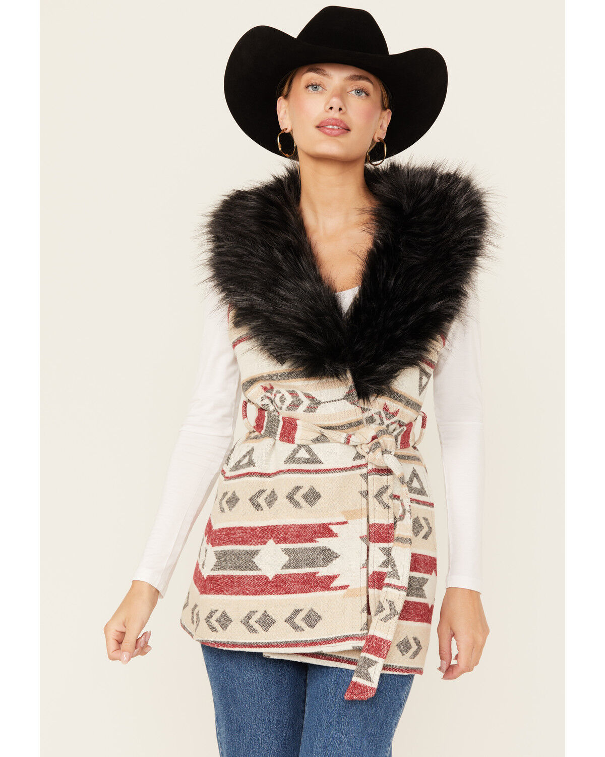 Cripple Creek Women's Southwestern Print Fur Collar Wrap Vest