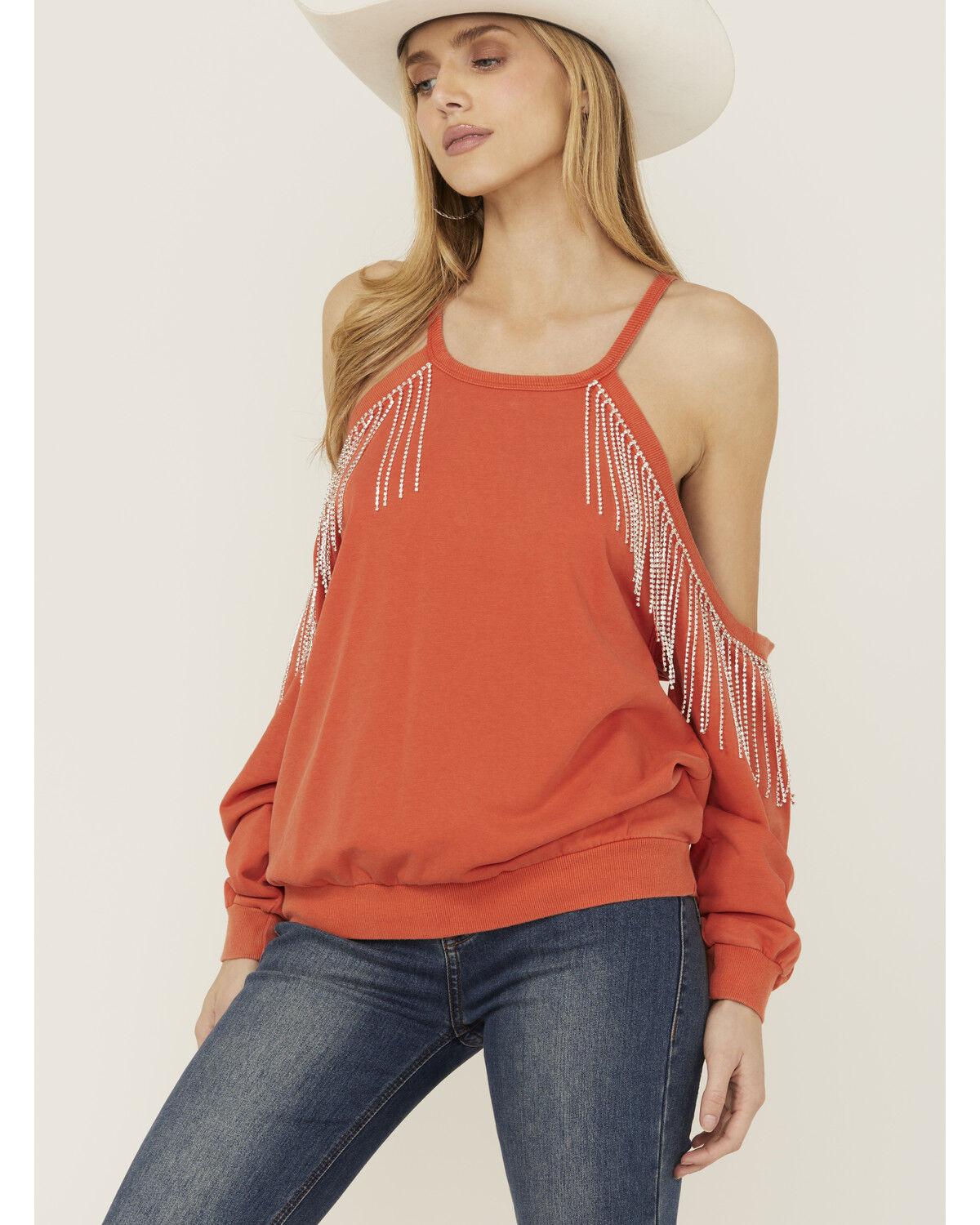 Blue B Women's Rhinestone Fringe Cold Shoulder Sweatshirt