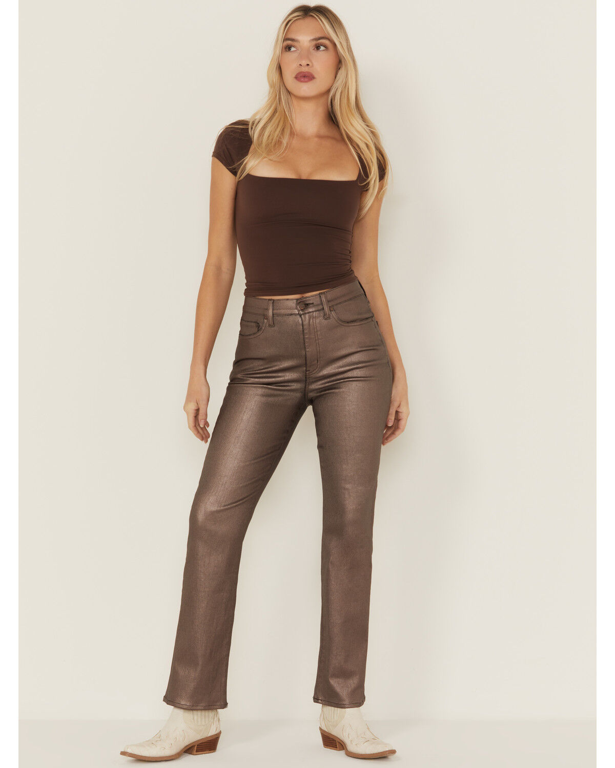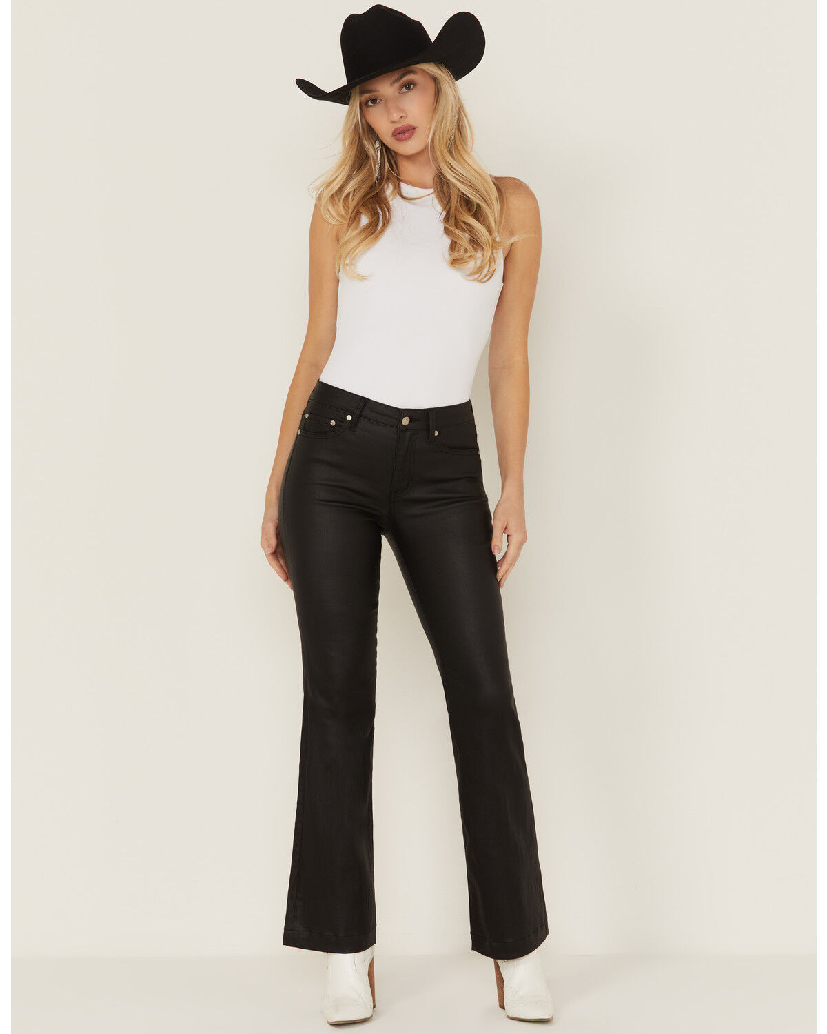 Daze Women's Mid Rise Coated Flare Stretch Pants