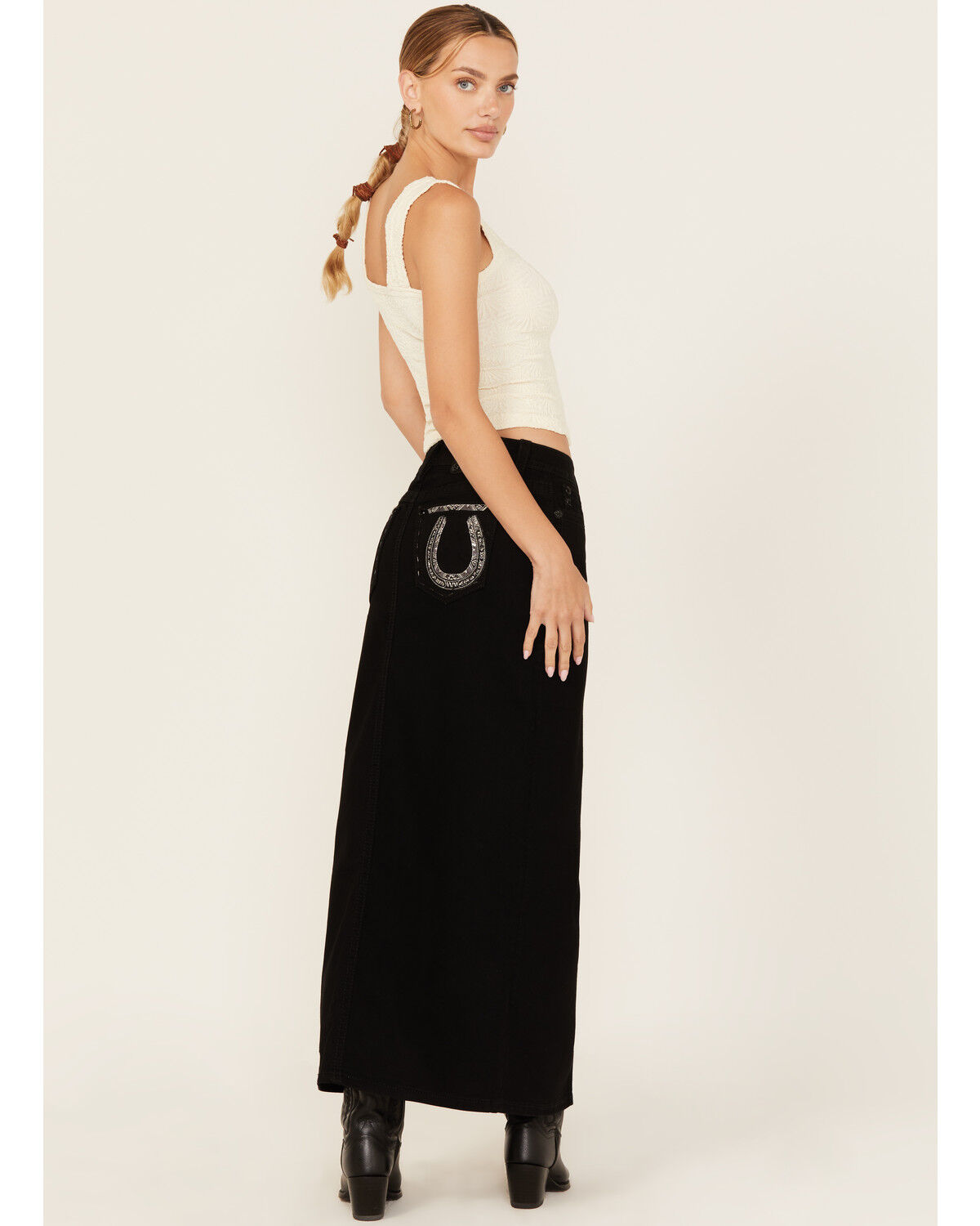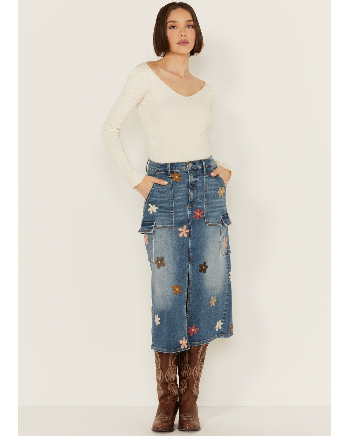 Miss Me Women's Embroidered Pocket Stretch Denim Maxi Skirt