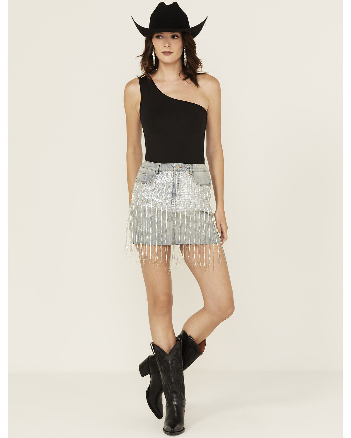 Blue B Women's Light Wash Fringe Mini Denim Skirt