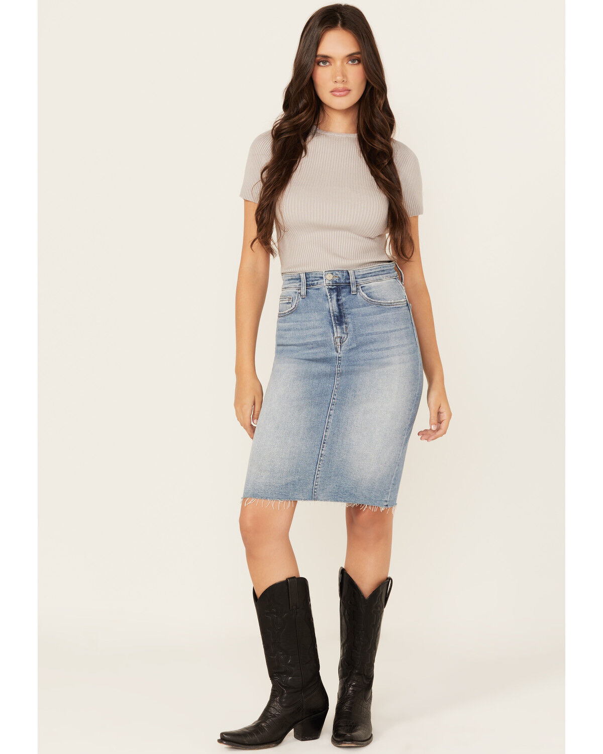 Flying Monkey Women's Raw Hem Medium Wash Denim Midi Skirt
