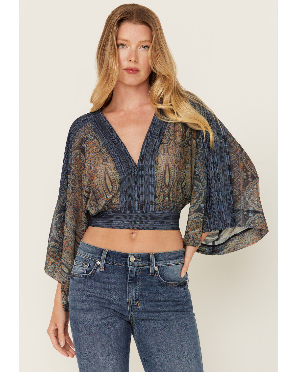 Beyond The Radar Women's Paisley Print Mesh Long Sleeve Top