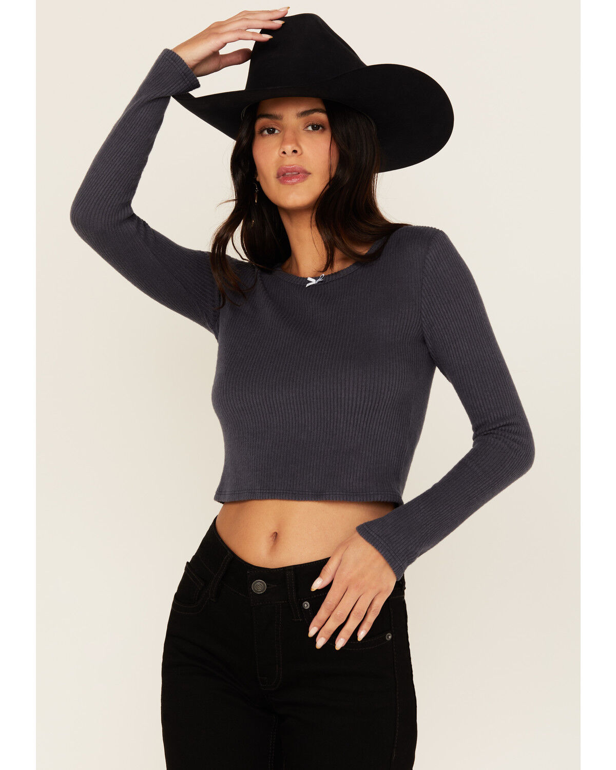 Originality Women's Solid Rib Knit Long Sleeve Cropped Shirt