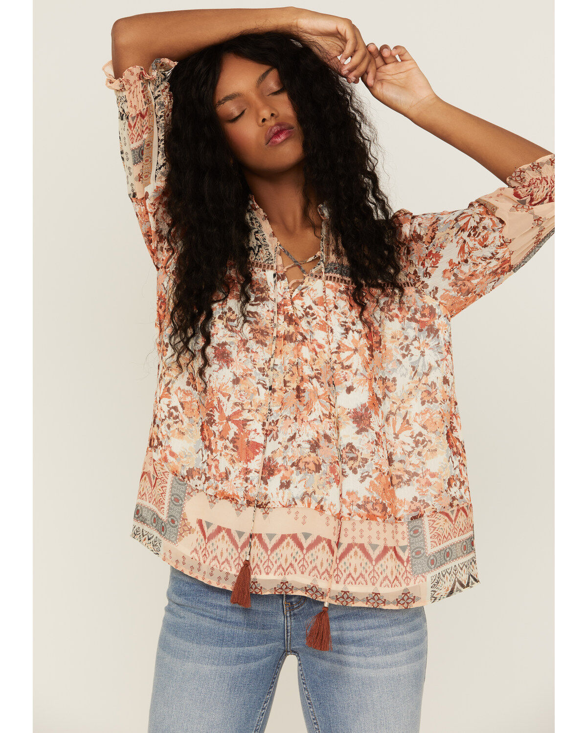 Miss Me Women's Mauve Patchwork Peasant Tassel Top