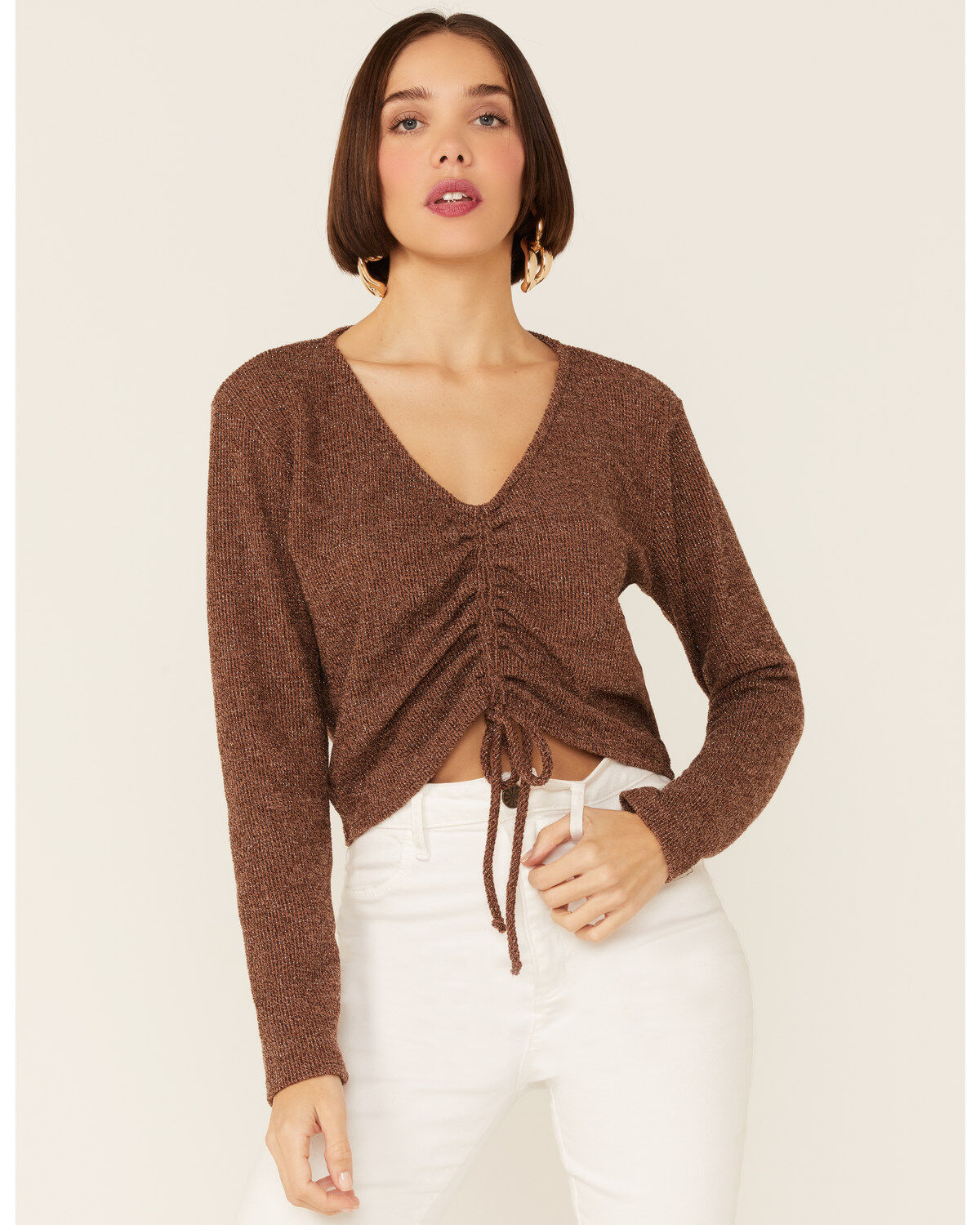Wild Moss Women's Brown Ribbed Lurex Cinch Front Knit Top