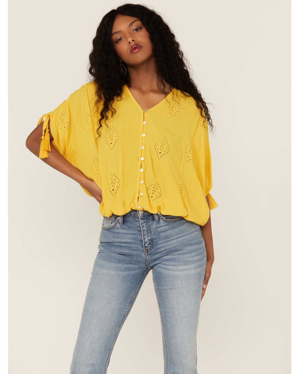 Miss Me Women's Mustard Button Front Embroidered Tassel Trim Top