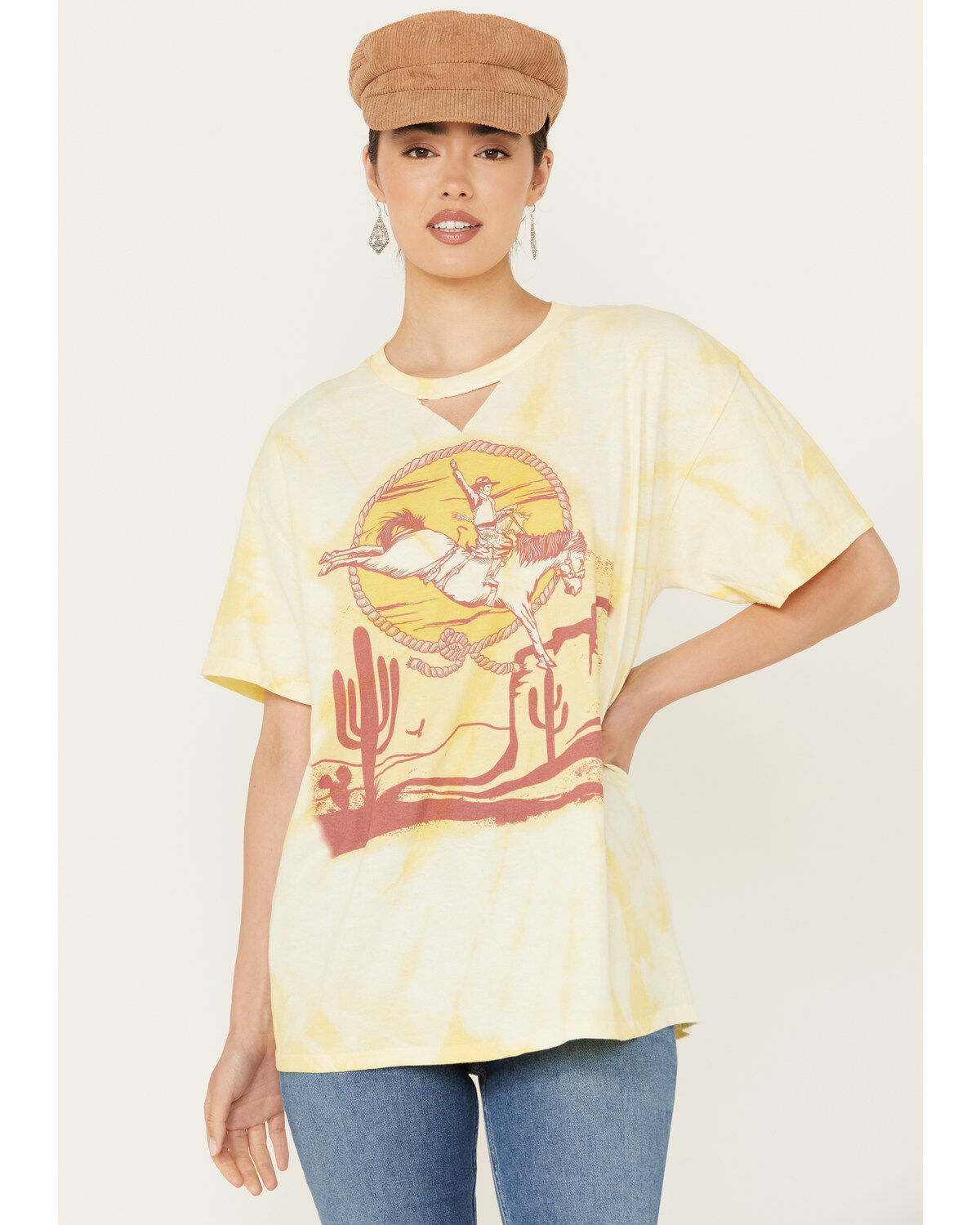 Gina Tees Women's Tie Dye Cut Out Desert Cowboy Graphic Tee