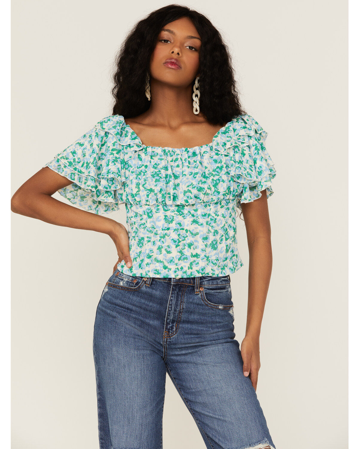 Molly Bracken Women's Floral Pattern Ruffle Sleeve Top