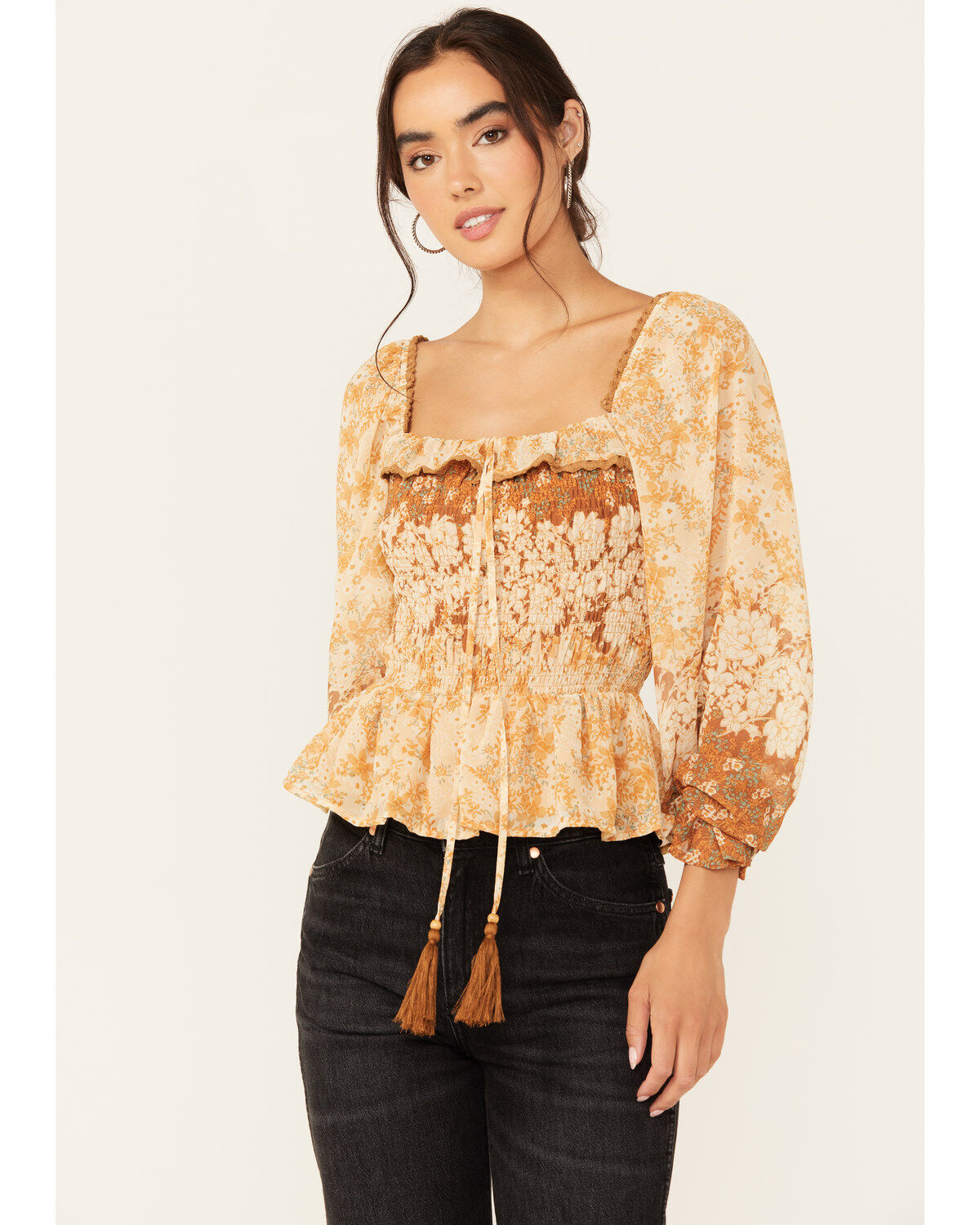 Miss Me Women's Floral Print Long Sleeve Peasant Top