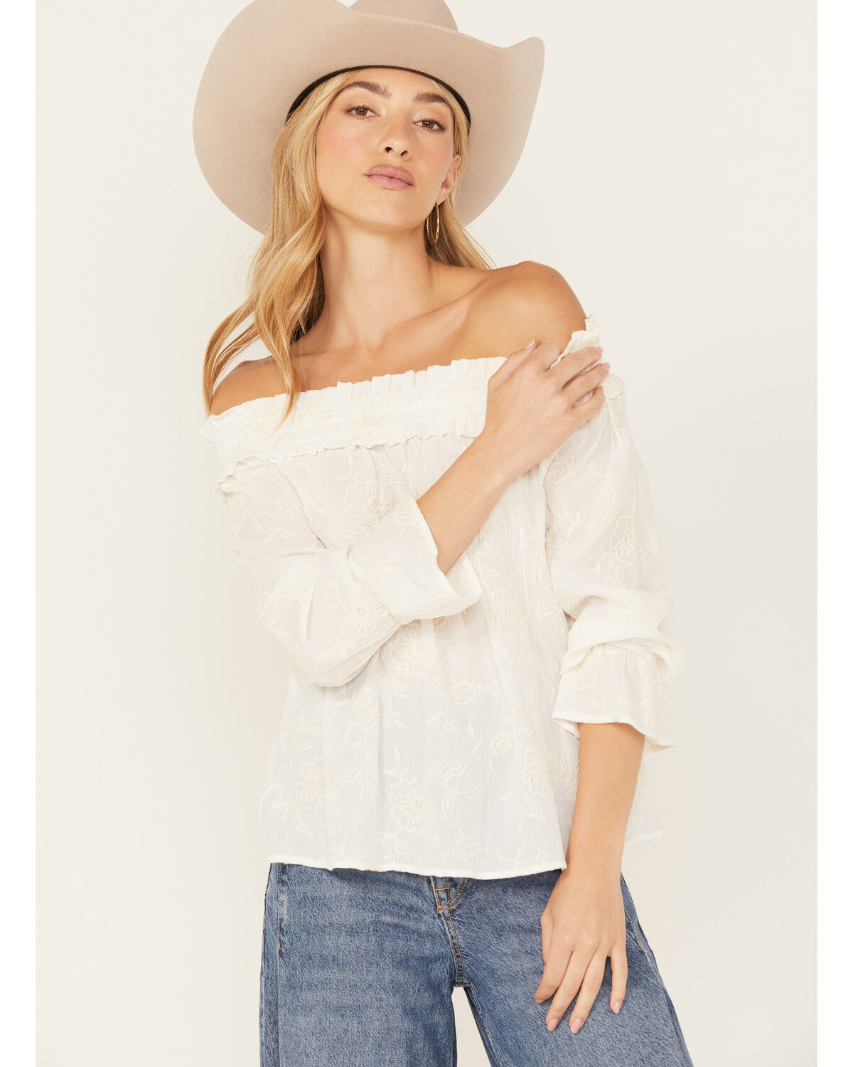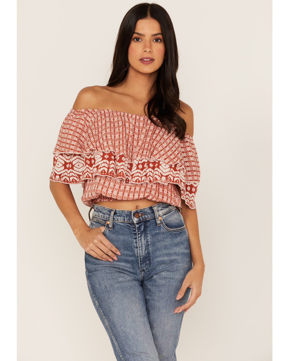 Talisman Women's Road Trip Print Ruffle Off-Shoulder Cropped Top