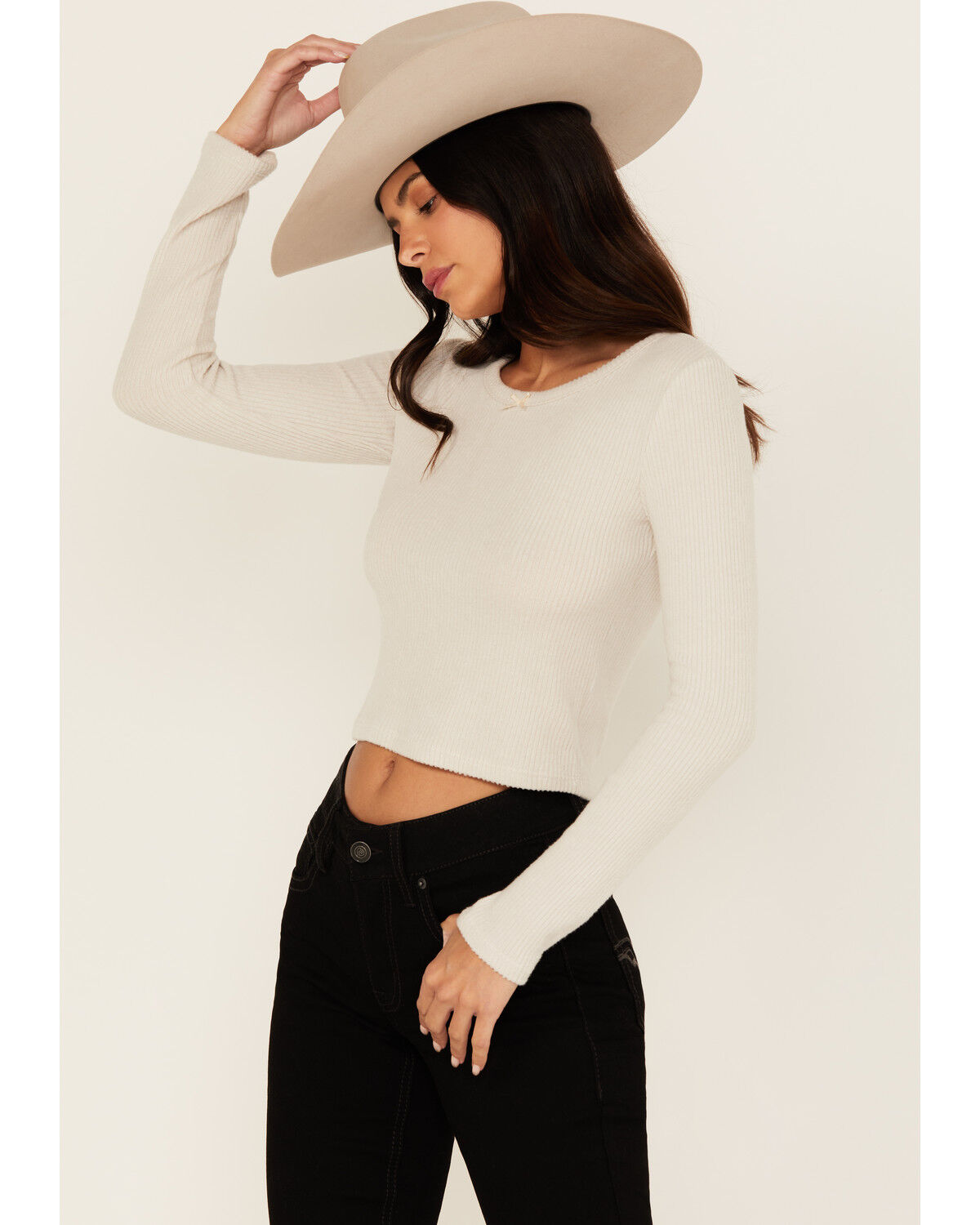 Originality Women's Solid Rib Knit Long Sleeve Cropped Shirt
