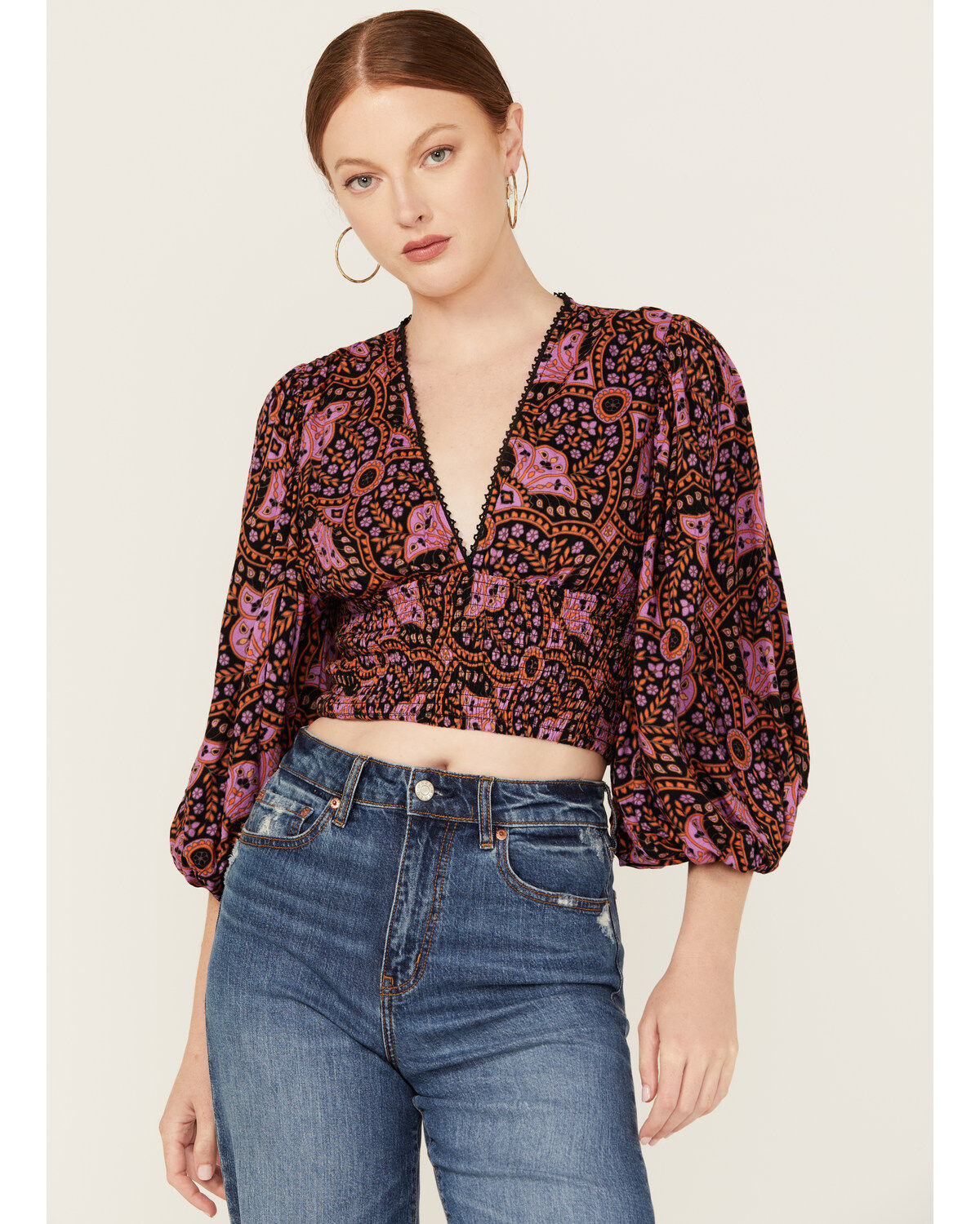 Shyanne Women's Burnout Satin Printed Peasant Top