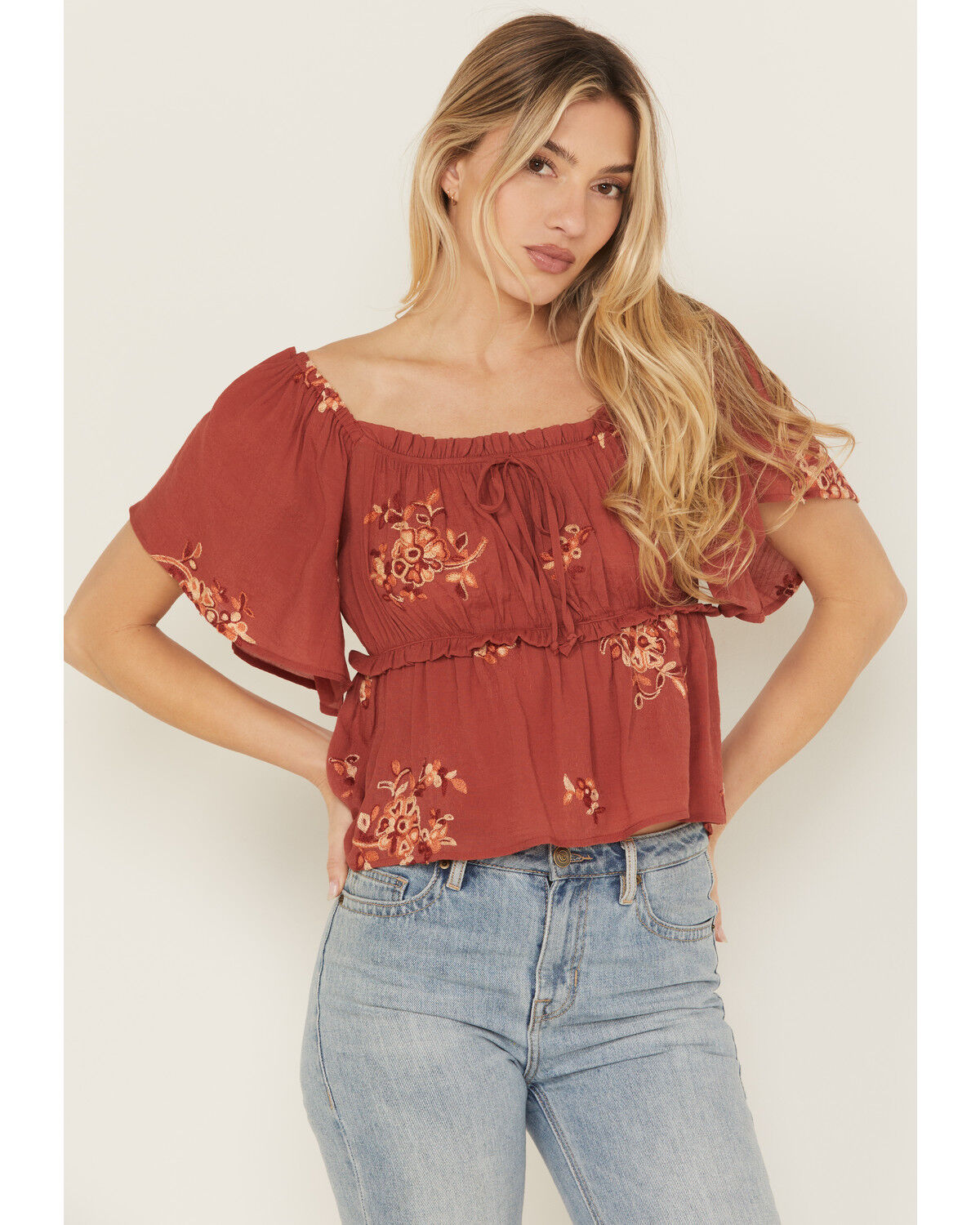 Wild Moss Women's Floral Embroidered Short Sleeve Peplum Top