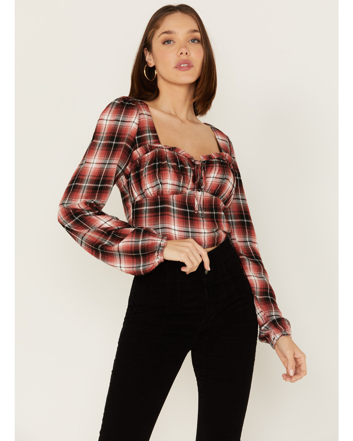 Wild Moss Women's Plaid Print Ruffle Tie Front Crop Top