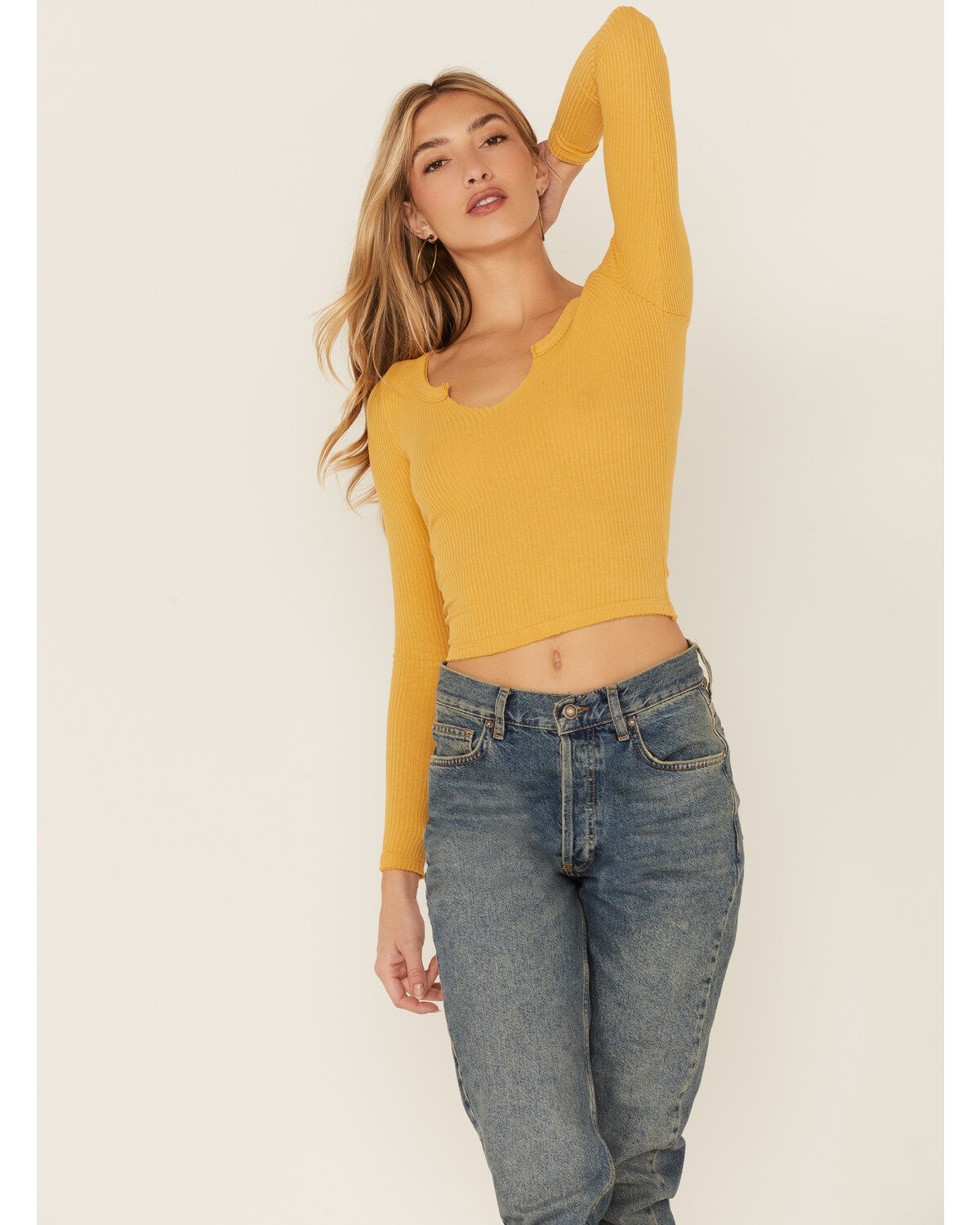 Wild Moss Women's Solid Long Sleeve Raw Edge Ribbed Knit Top