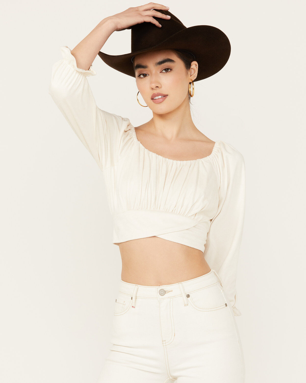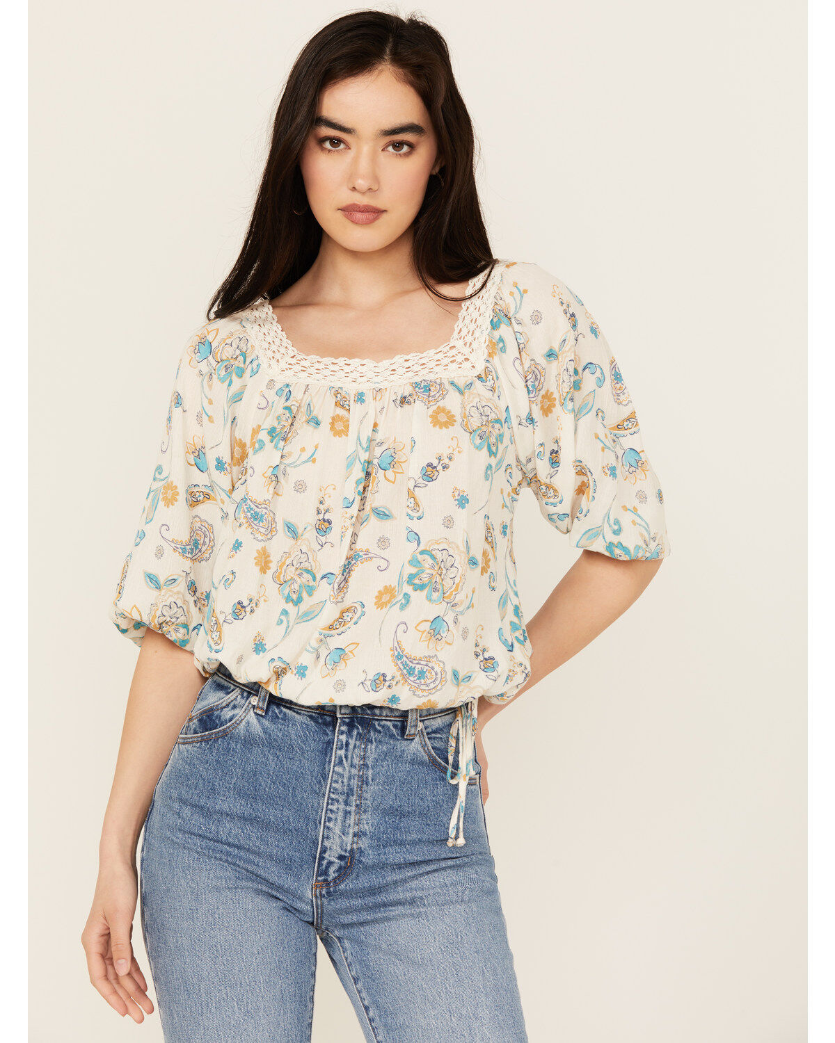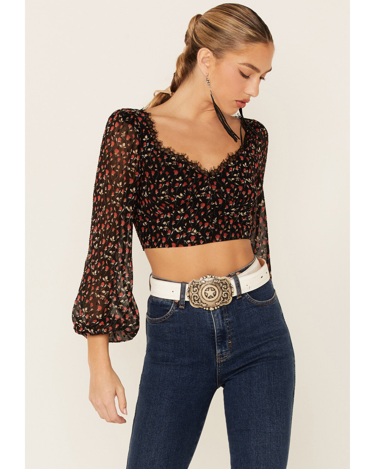 Lush Women's Lace Trim Rose Long Sleeve Crop Blouse