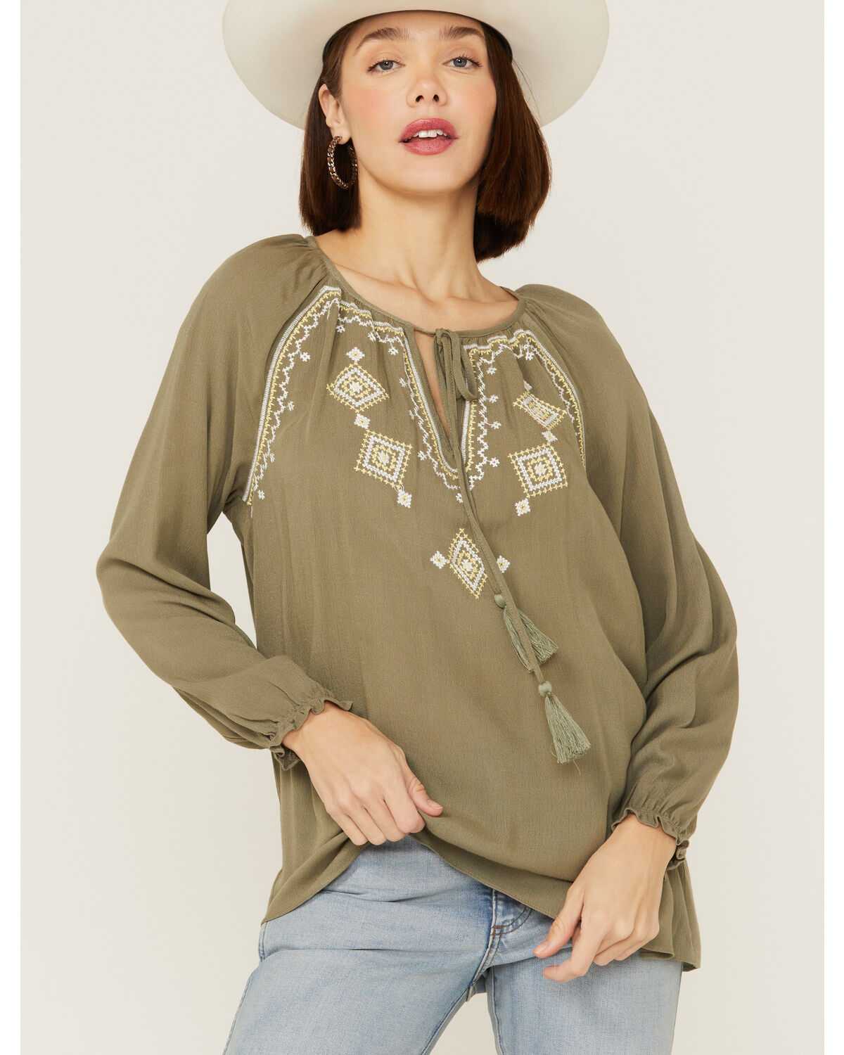 Miss Me Women's Olive Embroidered Southwestern Tassel Top