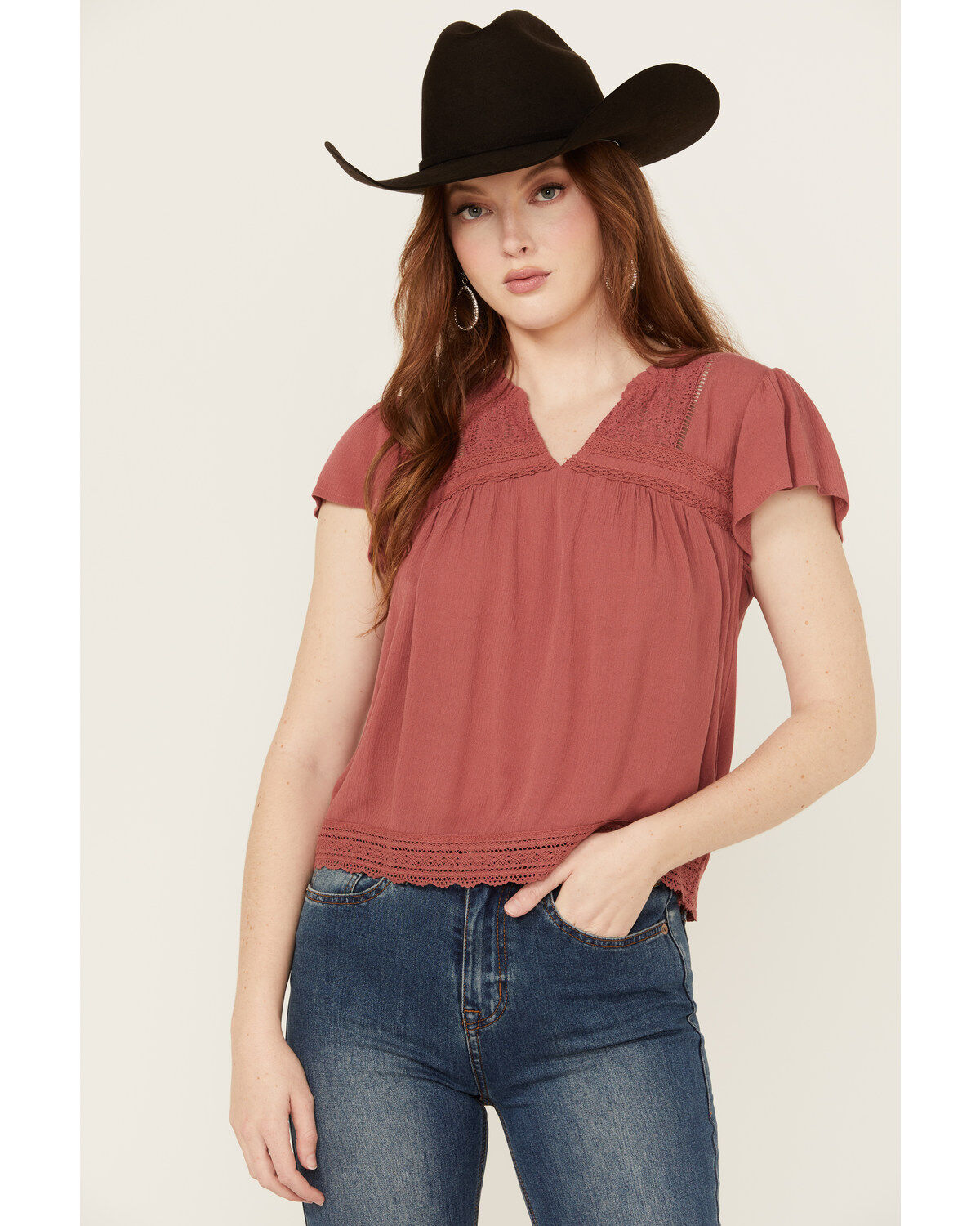 Jolt Women's Lace Trim Flutter Short Sleeve Top