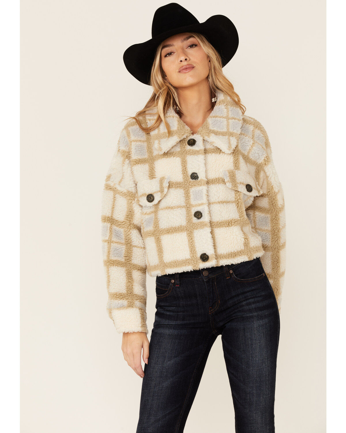Vigoss Women's Ivory Grid Print Cropped Sherpa Jacket
