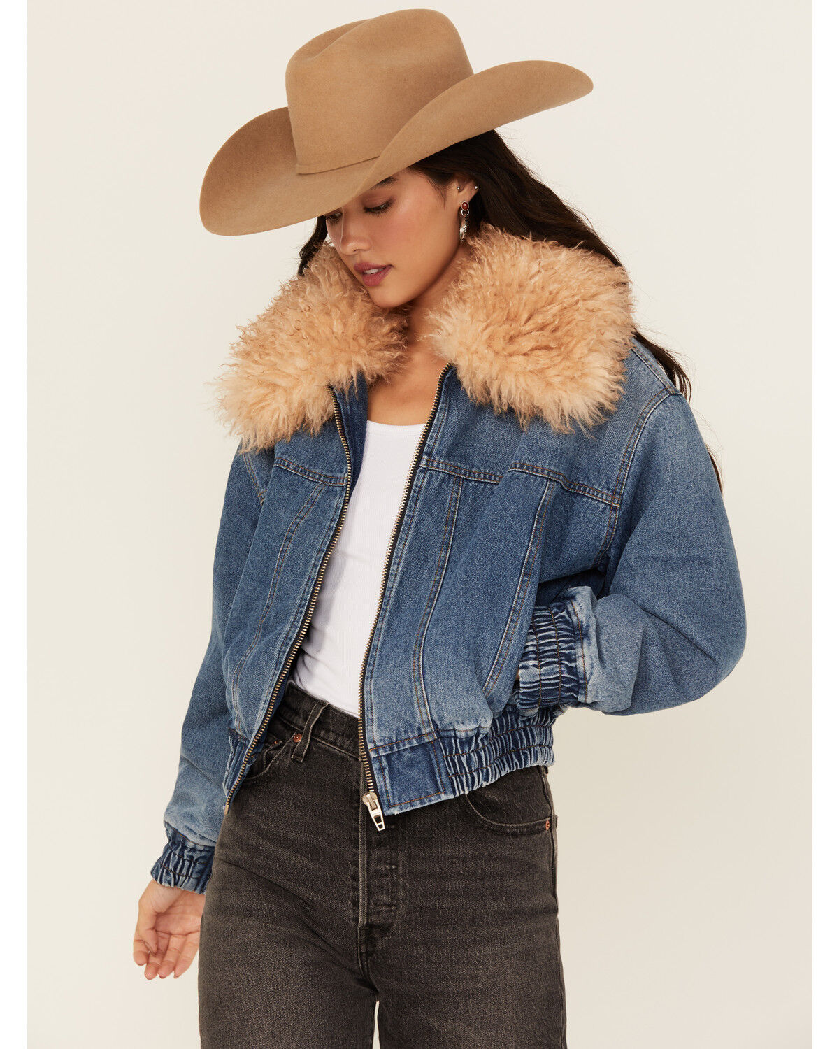 BLANKNYC Women's Fur Collar Denim Bomber Jacket